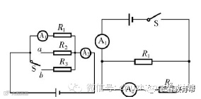 5.如左下图所示,电源电压保持不变,当开关S接a时,电流表A2上的示数与A1上的示数之比为5∶3,当开关S接b时,电流表A2上的示数与A1上的示数之比为3∶2,则电阻R2与R3阻值之比为_____