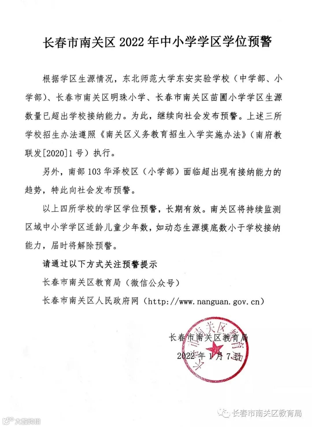 南关区将持续监测区域中小学学区适龄儿童少年数,如动态生源摸底数小于学校接纳能力,届时将解除预警。