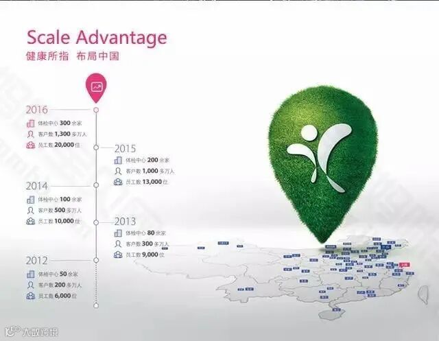 美年大健康产业(集团)股份有限公司始创于2005年,是中国预防性健康体检行业规模最 大的体检服务提供商。集团以上海为全国总部,覆盖29个省、直辖市、自治区,辐射包括 上海、北京、深圳、沈阳、广州、成都、重庆、大连、天津、哈尔滨等50多座核心城市, 200余家体检中心规模。由10000余位院士、教授、主任、医师、健康顾问等组成的专业 服务团队,2014年服务人次500多万,并以优质的服务和良好的信誉赢得了广大客户及管 理部门的高度评价。集团2015年成功在A股上市(SZ:002044),是医疗和大健康板块中市值和影响力领先的上市公司。