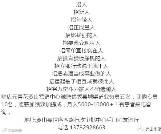 【招聘】古井贡酒年份原浆罗山店招聘店长一名女性,招业务员3名男女不限。底薪2500+提成☎:18037605262姚先生。