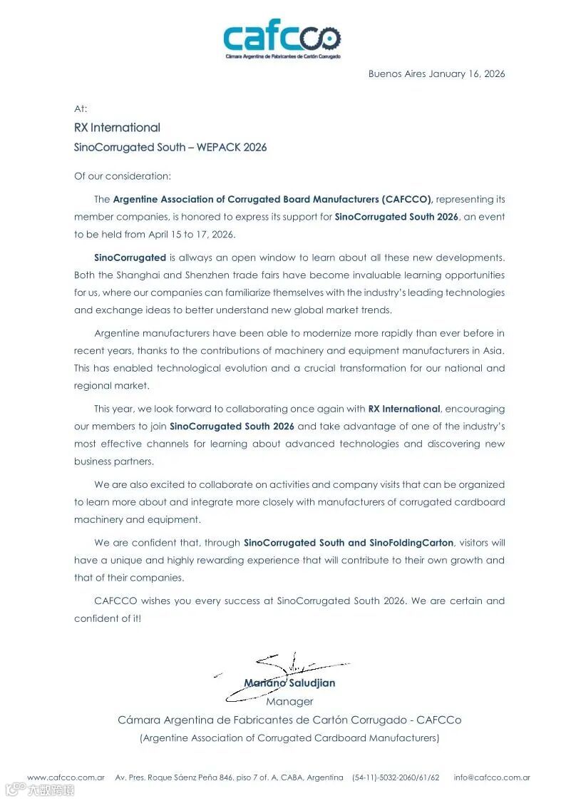 以下为阿根廷瓦楞纸板制造商商会(CAFCCo)致WEPACK 2026展会项目组的官方支持函原文: