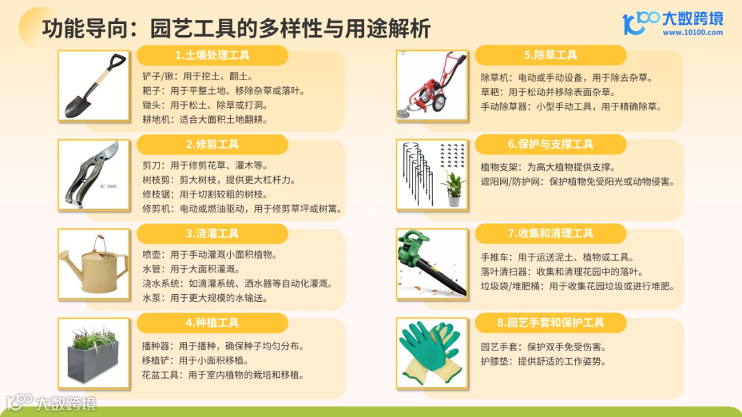 每类工具都有具体的用途,如修剪、浇水、除草等,帮助用户在不同园艺场景中提高工作效率,满足从家庭花园到专业园林维护的需求。