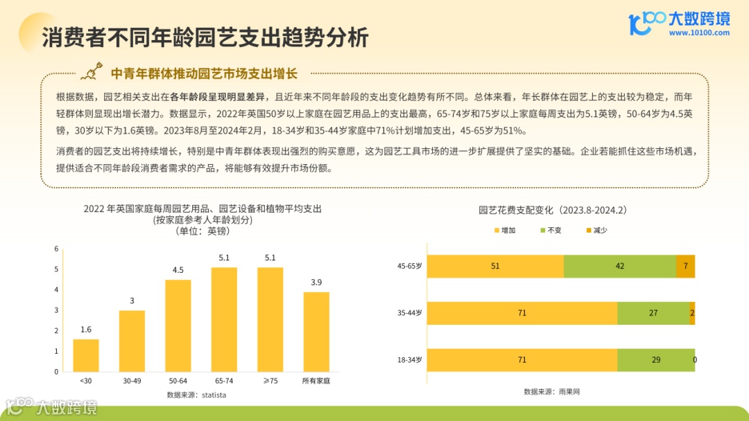 此外园艺相关支出在各年龄段呈现明显差异,且近年来不同年龄段的支出变化趋势有所不同。数据显示,2022年英国50岁以上家庭在园艺用品上的支出最高,65-74岁和75岁以上家庭每周支出为5.1英镑,50-64岁为4.5英镑,30岁以下为1.6英镑。