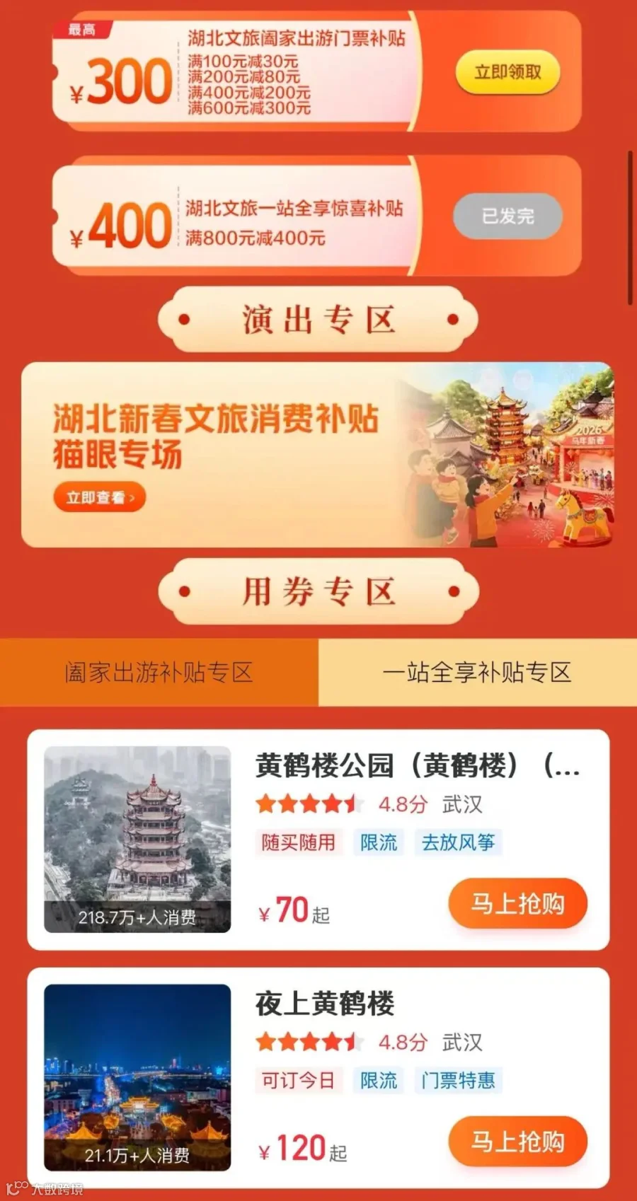 活动期间,全国消费者可通过在美团App或大众点评APP,搜索“知音湖北”跳转新春文旅消费补贴主会场,点击领券后,即可进入商品详情页面购买补贴商品,并在购票结算阶段享受补贴优惠。