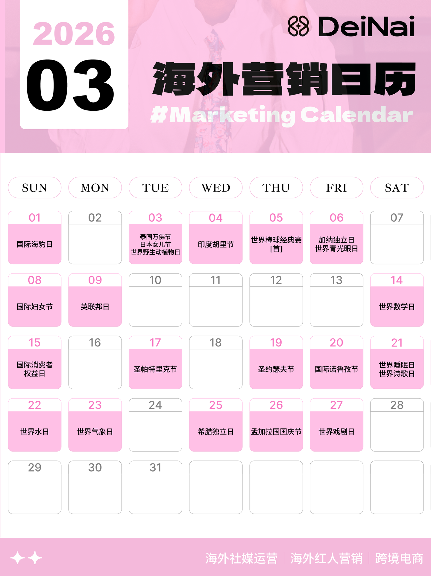 为了帮出海品牌营销人节省查资料的时间,把更多精力放在执行上,DeiNai 海外红人营销整理了这份3月海外营销日历。不仅有重点节日的背景解读、适配营销方向与关键词,还提供了可直接落地的红人营销灵感,内容策划、选品规划、投放策略都能直接参考。