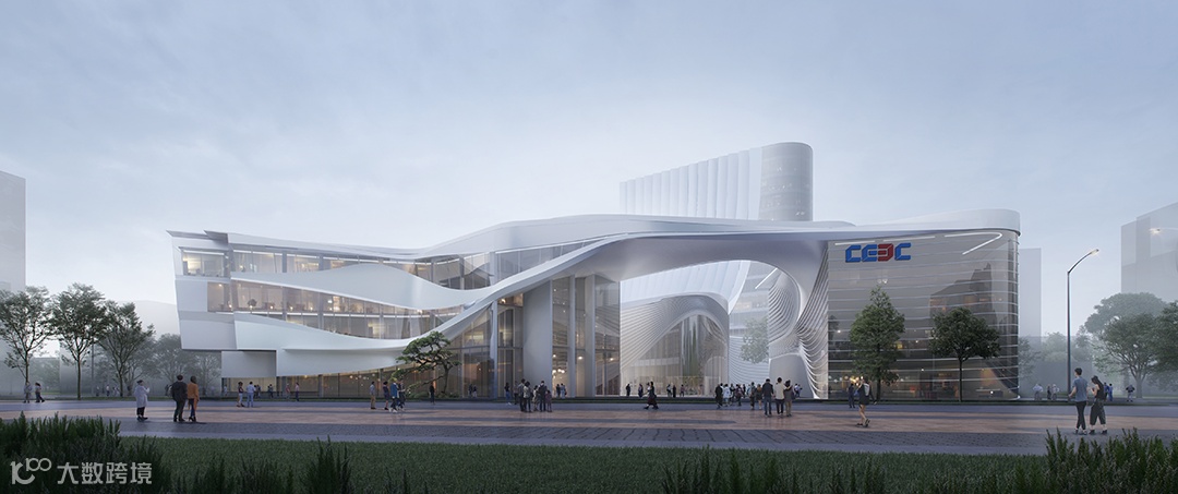 设计团队从认知自然、感知自然出发,将风、光、水、氢四大自然元素以建筑语言转译再现,让自然肌理与科技质感相融共生;同时结合场地主要城市展示面、人流方向划分地块,回应城市景观带和居住区景观视廊,通过形体折弯形成入口广场与景观通廊,让建筑与城市空间有机互动。