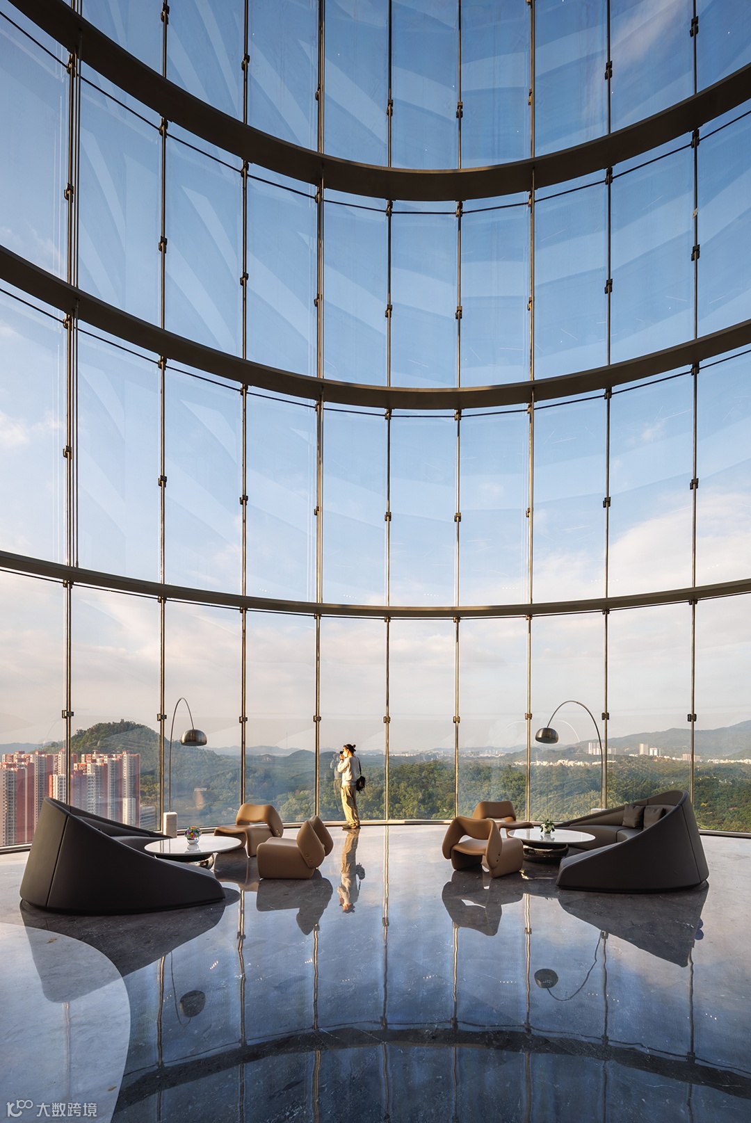 50米通高的总部空中大堂,采用无结构柱、弧形拉索玻璃幕墙设计,将场地周边的壮阔山水纳入办公区视野,并以“湾区灯塔”的地标形象引航片区发展。