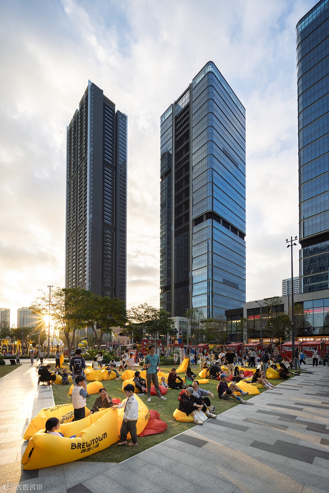 设计将人的活动置于空间的核心:林荫下的休憩台阶、互动水景与开放草坪,鼓励市民自发停留、相遇与参与。从晨间的慢跑到傍晚的市集喧闹以及夜晚节庆的欢聚,空间在不同时段被赋予不同的生命节奏,从而超越单纯的商业场所,成为一片真正属于市民的生活剧场。