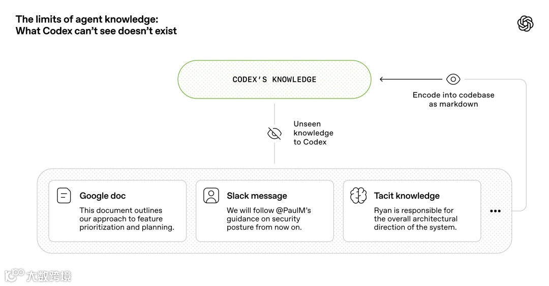 对 Agent 而言,运行时不可见的信息即不存在。Google Docs、聊天记录或人脑中的知识均不可访问;唯仓库本地、版本化的工件(代码、Markdown、Schema、可执行计划)构成其全部认知世界。