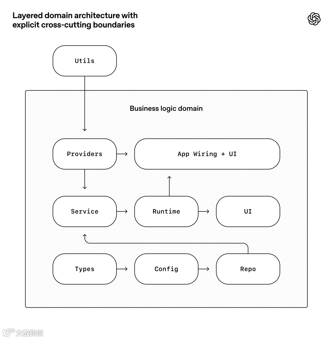 Agent 在边界清晰、结构可预测环境中效率最高。因此,应用基于一套刚性架构模型构建:每个业务领域划分为固定层级,依赖方向严格验证,连接点有限。此类约束由自定义 Linter(同样由 Codex 生成)与结构化测试机械化执行。