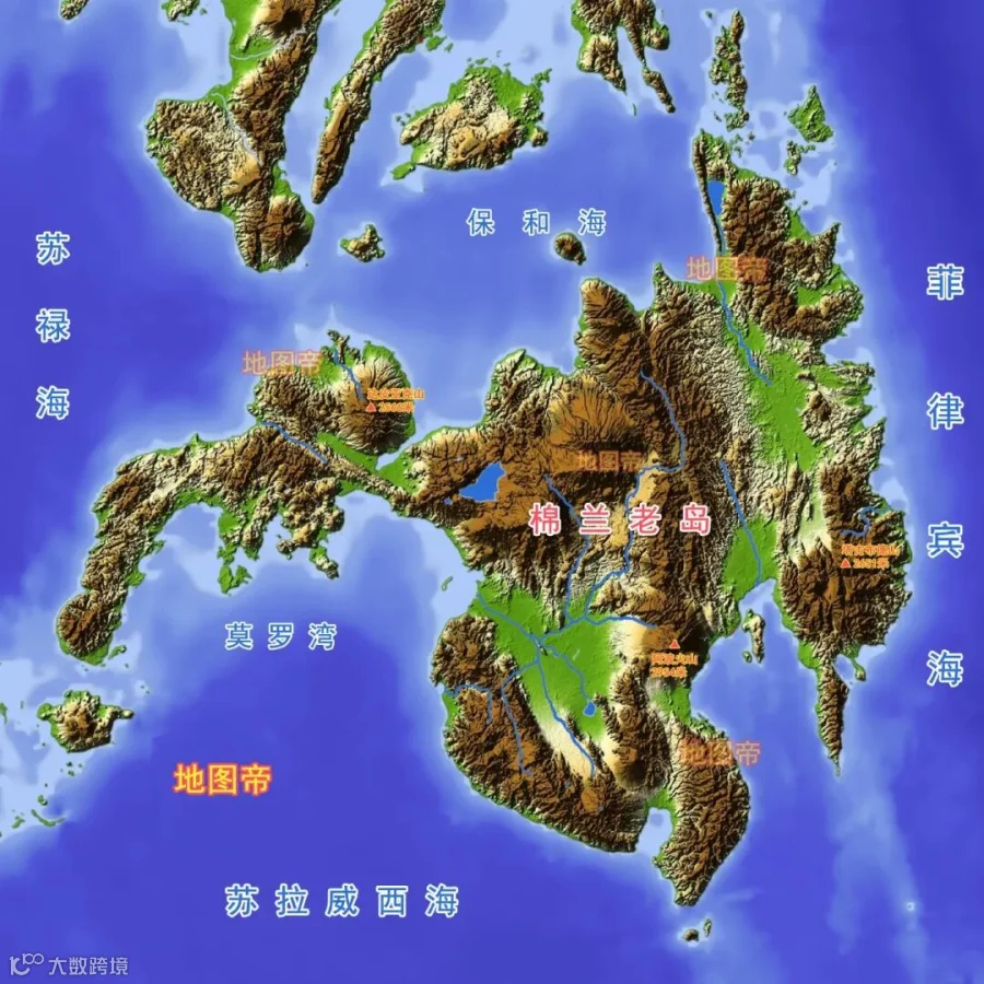 棉兰老岛,四周分别为保和海、菲律宾海、苏拉威西海、苏禄海,东西长528千米,南北宽471千米,这个岛面积9.75万平方千米,是菲律宾第二大岛。棉兰老岛多火山,主要山脉呈南北走向,最高峰为阿波火山,海拔2954米,为菲律宾最高峰。