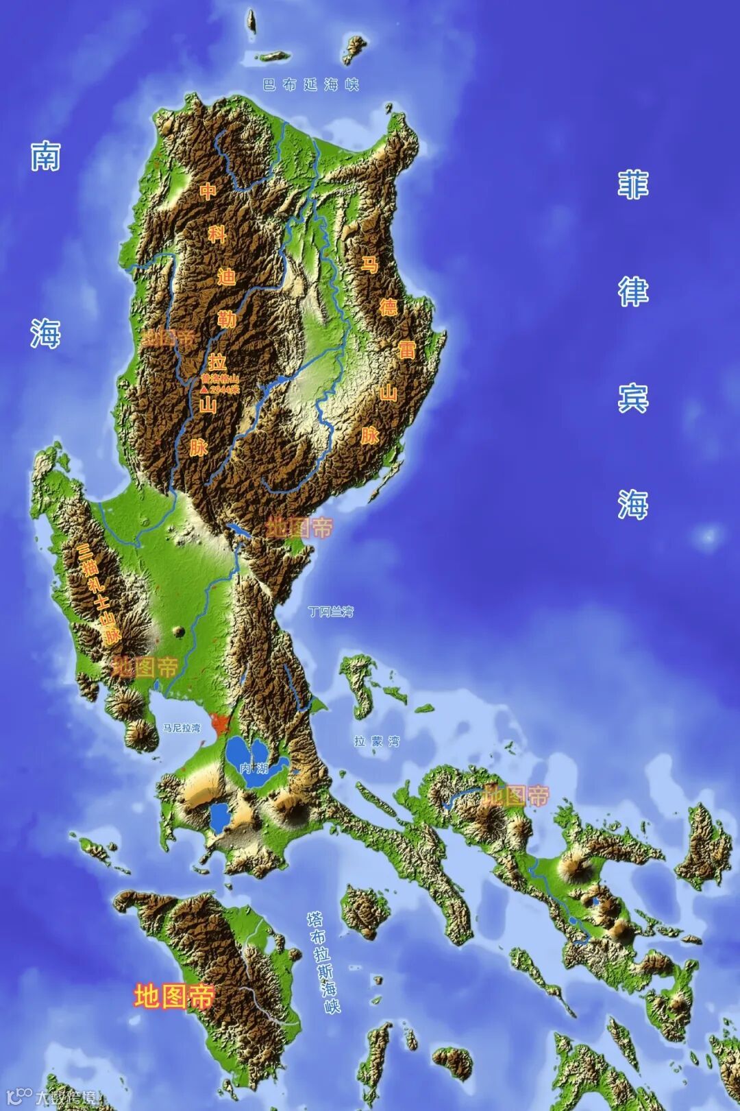 吕宋岛,南北长740千米,东西宽225千米,面积约11.00万平方千米,约为台湾岛的三倍,是菲律宾最大的岛,为世界第15大岛。吕宋岛山脉多呈南北走向,最高峰是中科迪勒拉山脉南部的普洛格山,海拔2944米,为菲律宾第二高峰。