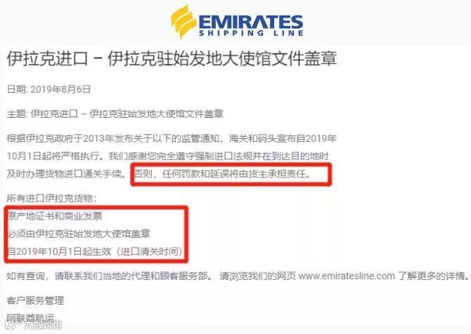 新规如下:所有进口伊拉克货物,原产地证书和商业发票,必须由伊拉克驻始发地大使馆盖章(目前需要有第三方检测机构出认证,加签时效约一个半月,要求比较严苛)。请大家务必遵照执行,否则任何罚款和延误将由货主承担责任。