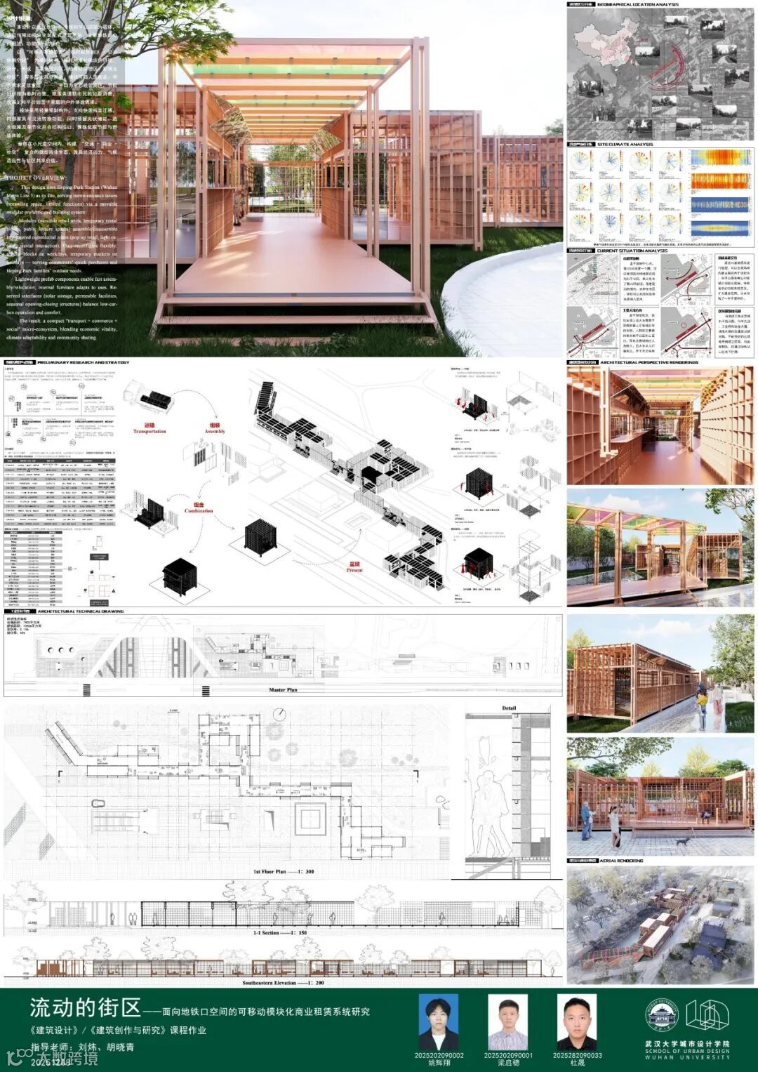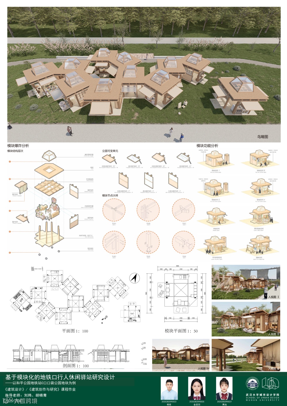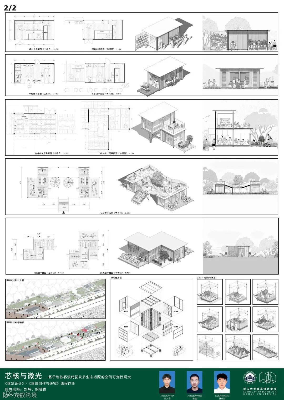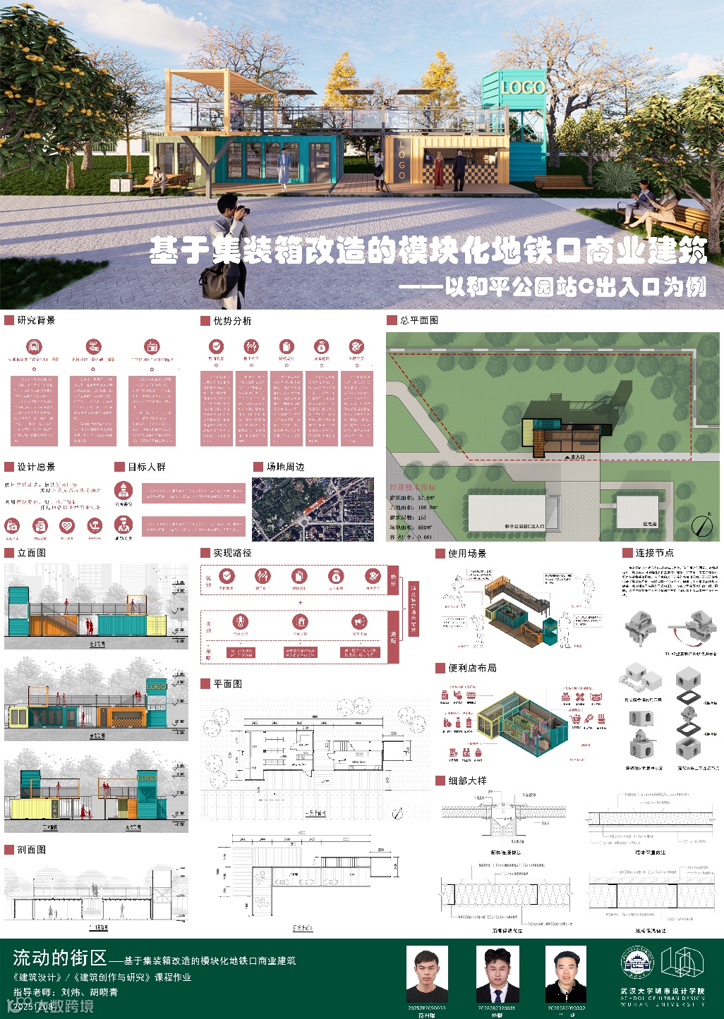 课题面对城市更新、社区服务、文化旅游、灾害救援等多样化城市场景,提出一种可移动、模块化的轻型建筑系统,以产品化的设计思路实现可居、可游、可商等“最小空间,弹性功能”的适应性需求。本次课程针对地铁站点周边闲置空间,以武汉市和平公园地铁站C出入口口袋公园为任务场地,进行临时商业设施设计,开展模块化建筑系统的研究或方案设计。通过企业出题、现场调研、科学研究、AI辅助设计以及导师评图等形式,探讨在城市更新时代背景下,创新建筑市场需求的实践路径。九组同学从不同侧面进行了卓有成效的探讨。
