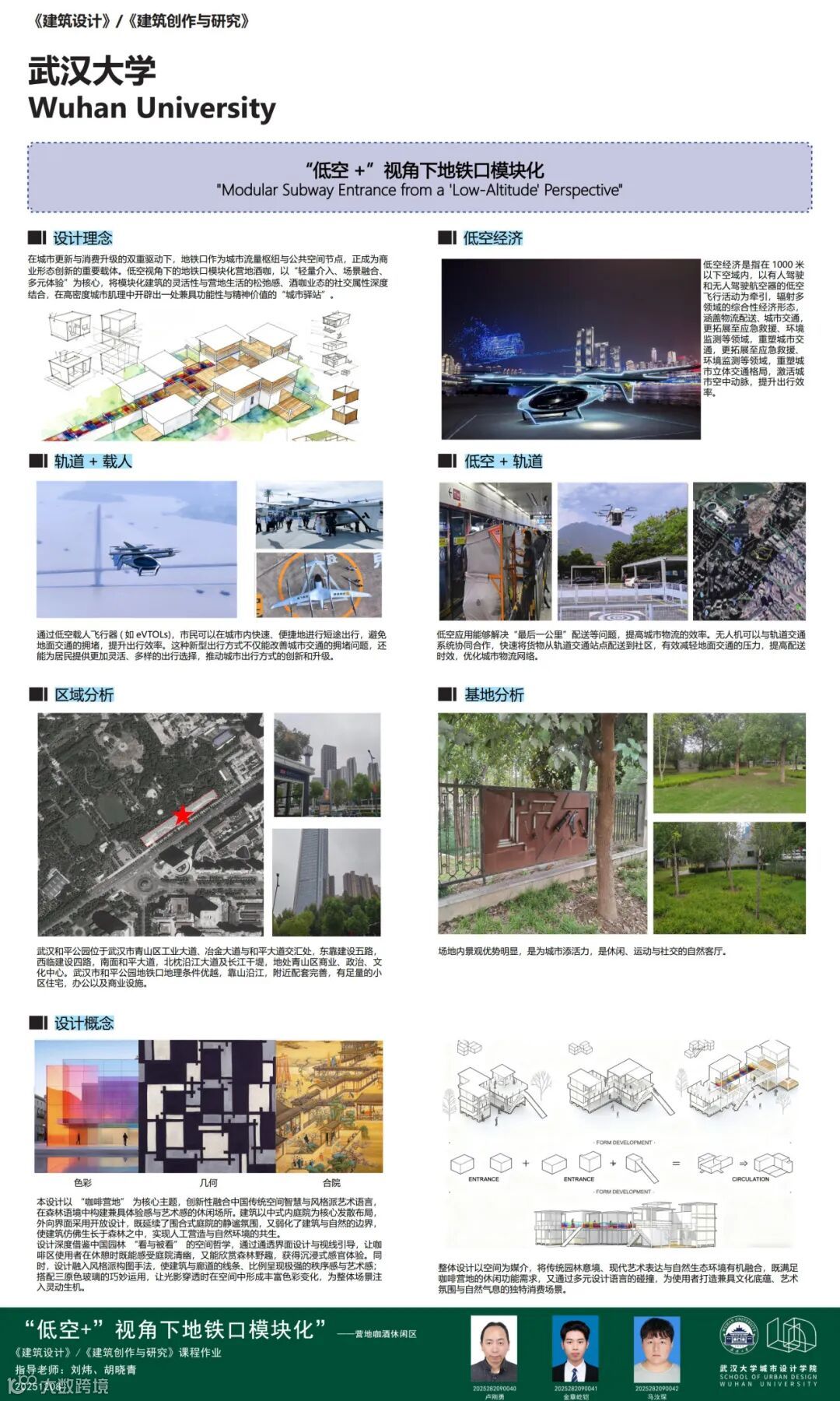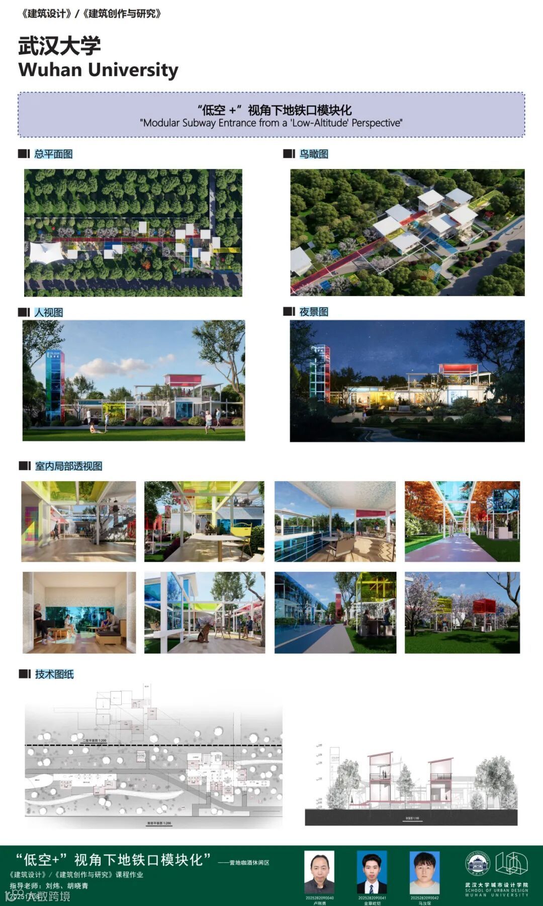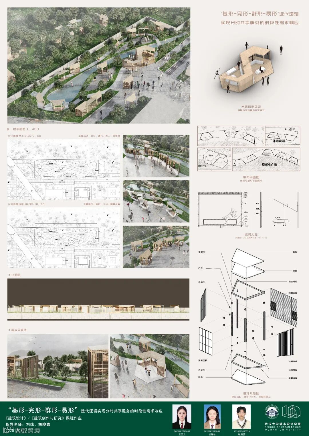 课题面对城市更新、社区服务、文化旅游、灾害救援等多样化城市场景,提出一种可移动、模块化的轻型建筑系统,以产品化的设计思路实现可居、可游、可商等“最小空间,弹性功能”的适应性需求。本次课程针对地铁站点周边闲置空间,以武汉市和平公园地铁站C出入口口袋公园为任务场地,进行临时商业设施设计,开展模块化建筑系统的研究或方案设计。通过企业出题、现场调研、科学研究、AI辅助设计以及导师评图等形式,探讨在城市更新时代背景下,创新建筑市场需求的实践路径。九组同学从不同侧面进行了卓有成效的探讨。