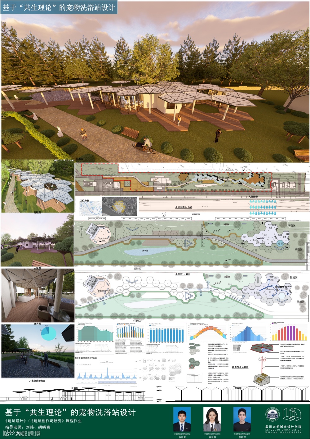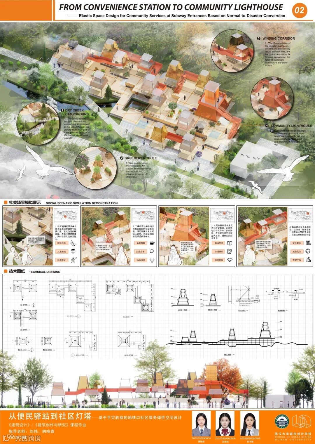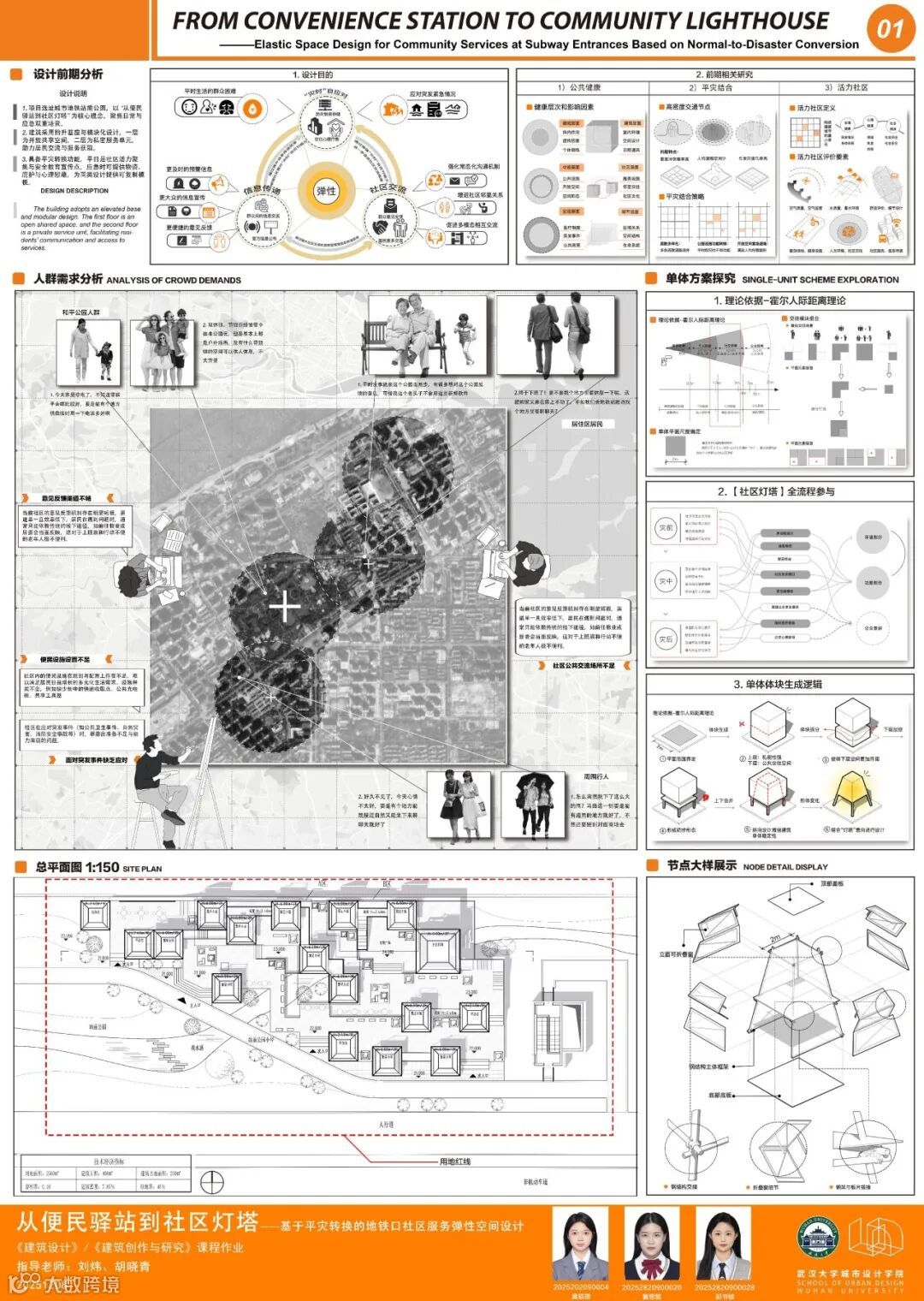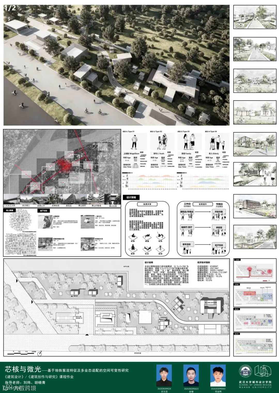 课题面对城市更新、社区服务、文化旅游、灾害救援等多样化城市场景,提出一种可移动、模块化的轻型建筑系统,以产品化的设计思路实现可居、可游、可商等“最小空间,弹性功能”的适应性需求。本次课程针对地铁站点周边闲置空间,以武汉市和平公园地铁站C出入口口袋公园为任务场地,进行临时商业设施设计,开展模块化建筑系统的研究或方案设计。通过企业出题、现场调研、科学研究、AI辅助设计以及导师评图等形式,探讨在城市更新时代背景下,创新建筑市场需求的实践路径。九组同学从不同侧面进行了卓有成效的探讨。