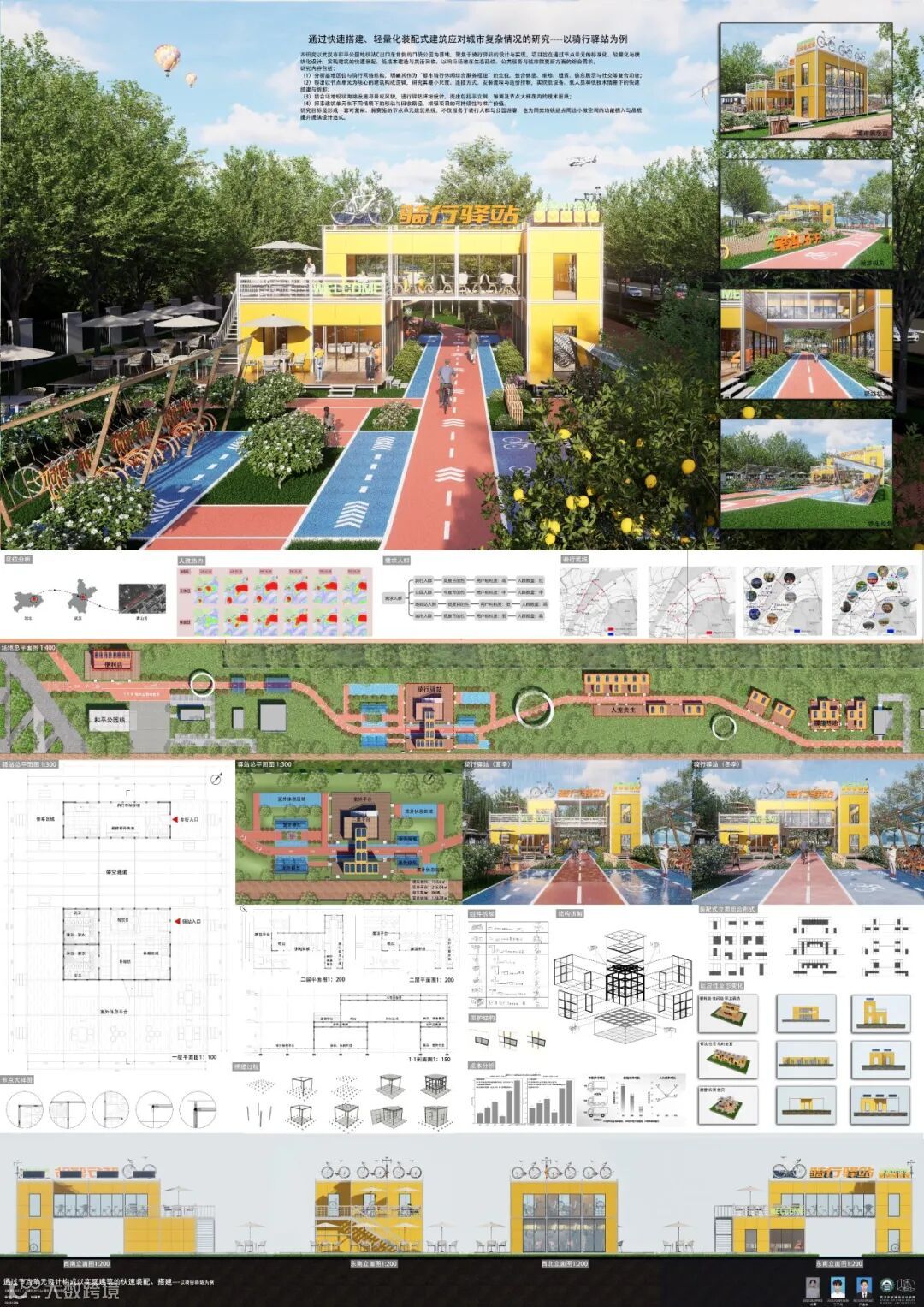 随着武汉地铁网络的快速扩张,地铁站点周边土地的高效利用与功能复合成为提升城市品质的关键。本研究以武汉市和平公园地铁站C出口东北侧的口袋公园为基地,聚焦于骑行驿站的设计与实现。项目旨在通过节点单元的标准化、轻量化与模块化设计,实现建筑的快速装配、低成本建造与灵活回收,以响应在绿色环保、公共服务与城市微更新方面的综合需求。