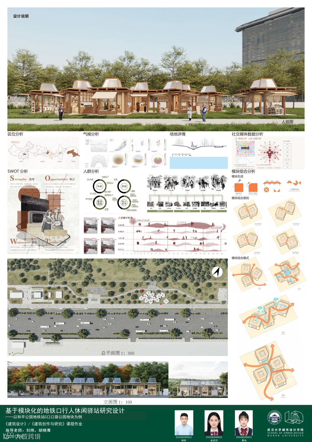 本设计聚焦武汉地铁口空间利用粗放问题,以 5 号线和平公园站 7400㎡场地为载体,构建 “可移动零售 + 临时租赁 + 公共休闲” 的复合商业系统。设计延续场地海绵生态基底,针对亲子家庭与通勤人群核心需求,打造车站服务、租赁互动等功能模块。系统采用标准化模块化设计,基于露营装备尺寸提炼单元规格,通过开放、半开放、封闭三种模块组合,实现快闪零售、轻餐饮、装备租赁等多元场景切换。