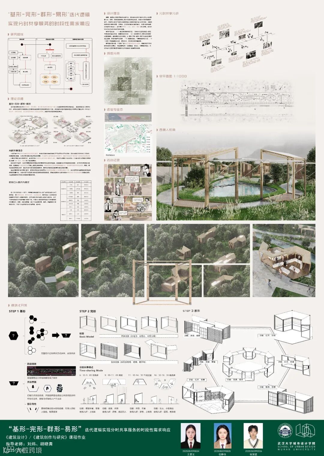 随着武汉地铁网络的快速扩张,地铁站点已成为城市公共生活的重要节点。然而,目前多数地铁口周边空间利用率较低,未能充分发挥其服务潜力。本研究探索在有限空间内通过轻质、可移动、可组合的模块化建筑单元,实现分时共享服务功能的创新设计。研究基于“基形-完形-群形-易形”迭代逻辑,提升地铁口空间的利用效率与服务质量。研究内容包括:(1)通过实地调研等方法,分析和平公园站周边人群在不同时段的需求特征,明确功能优先级;(2)结合国内外共享空间与模块化建筑案例,提炼模块化设计原则,以“基形-完形-群形-易形”为层级的模块组合逻辑,实现功能灵活切换;(3)构建标准化、可复制的模块体系;(4)形成一套涵盖需求分析、模块设计、技术实现的完整框架。