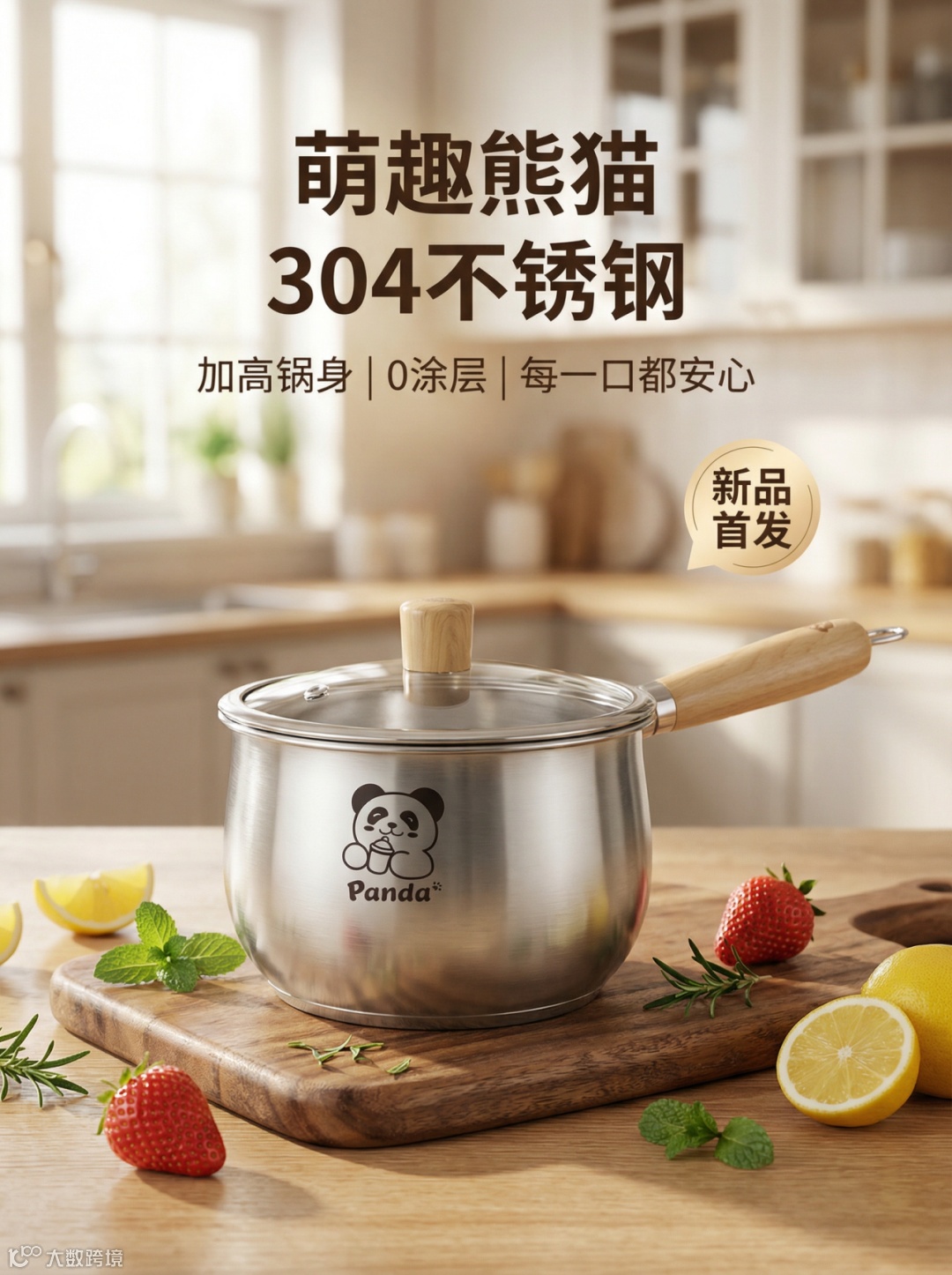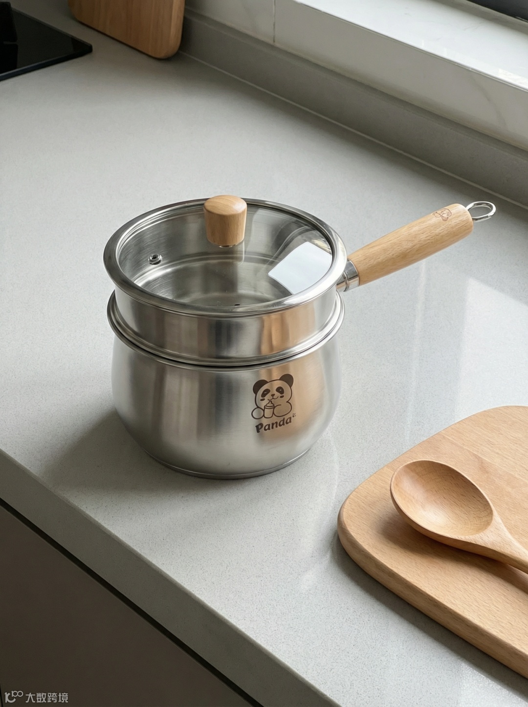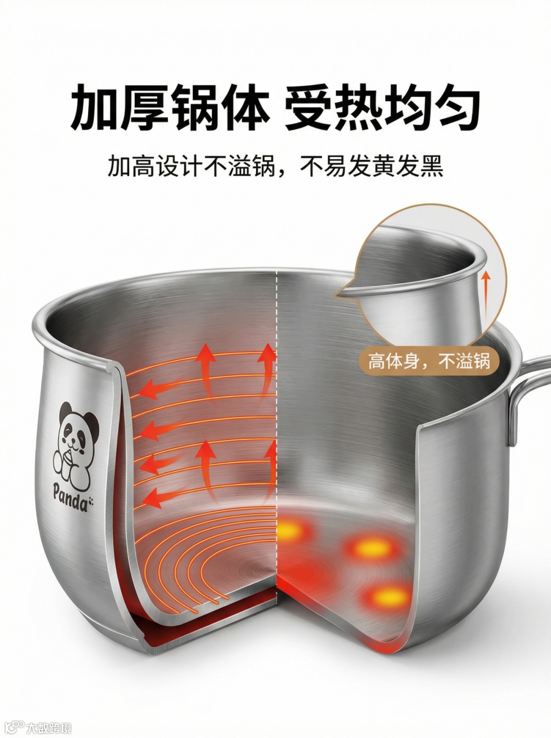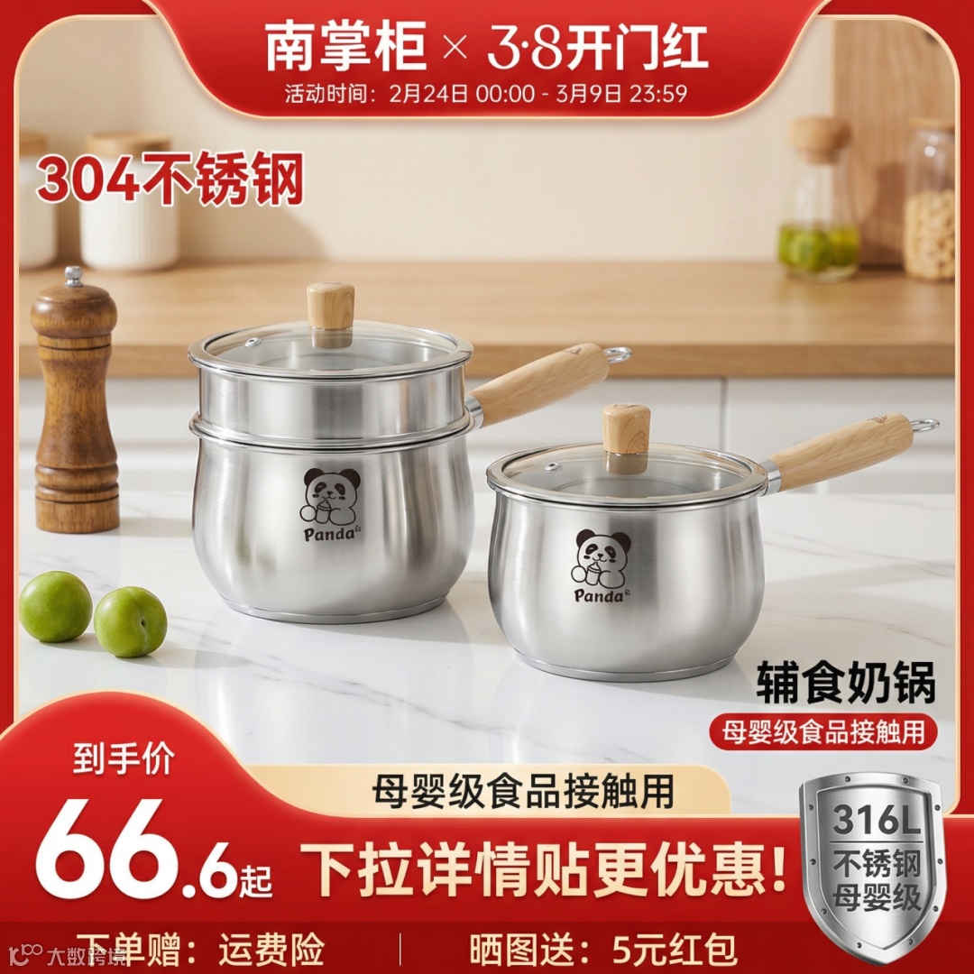 提示词:萌趣熊猫304不锈钢加高奶锅/辅食锅