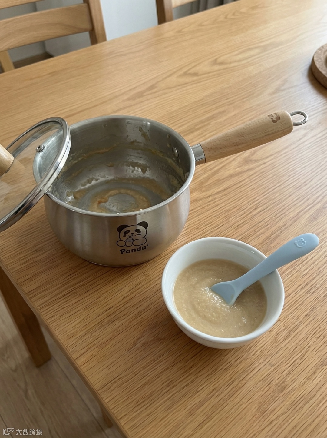 - 宝妈的第一人称视角(正在给宝宝蒸南瓜泥,熊猫图案正对着镜头);