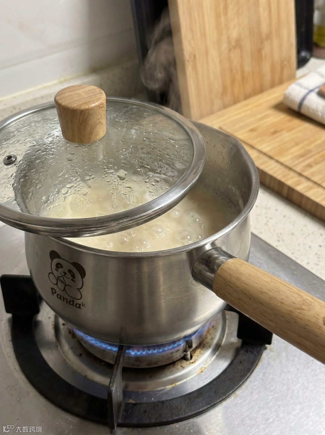 - 清晨的燃气灶上(锅里煮着热牛奶,蒸汽氤氲,透过玻璃盖能看到牛奶翻滚);