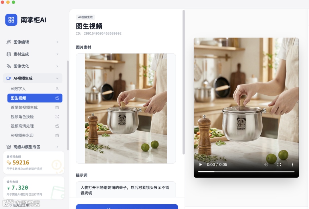 主图视频是提升搜索权重的加分项。只需上传奶锅图片并输入提示词,AI即可根据文案让画面动起来。视频中的产品保持高度还原,细节清晰不失真,为消费者提供更多维度的产品展示。