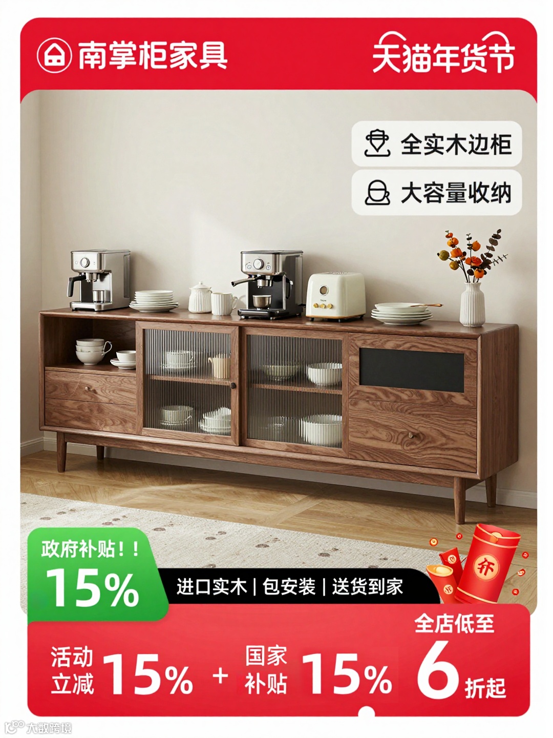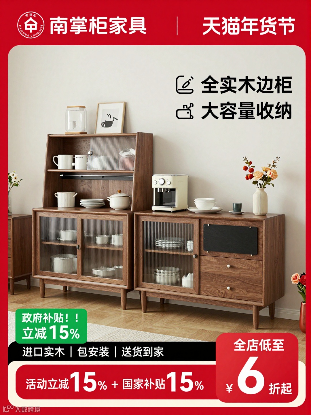 画面顶部是红色横幅,左侧是 “南掌柜家具” 品牌标识,右侧标注 “天猫年货节” 字样;右上角用图标 + 文字突出产品核心卖点:“全实木边柜”“大容量收纳”。