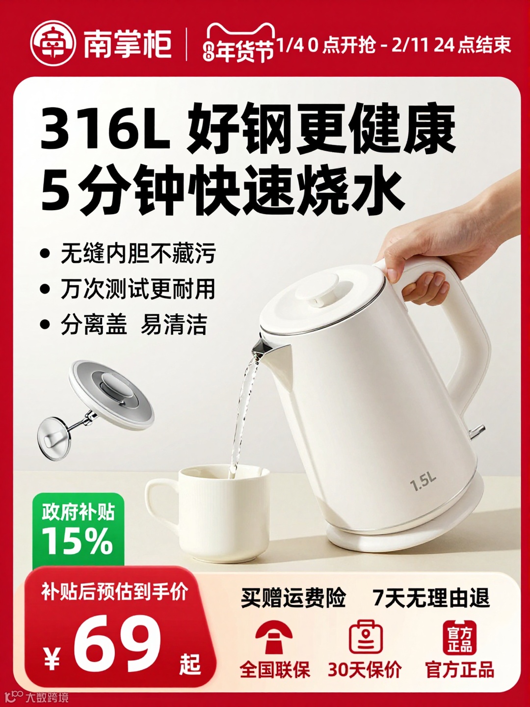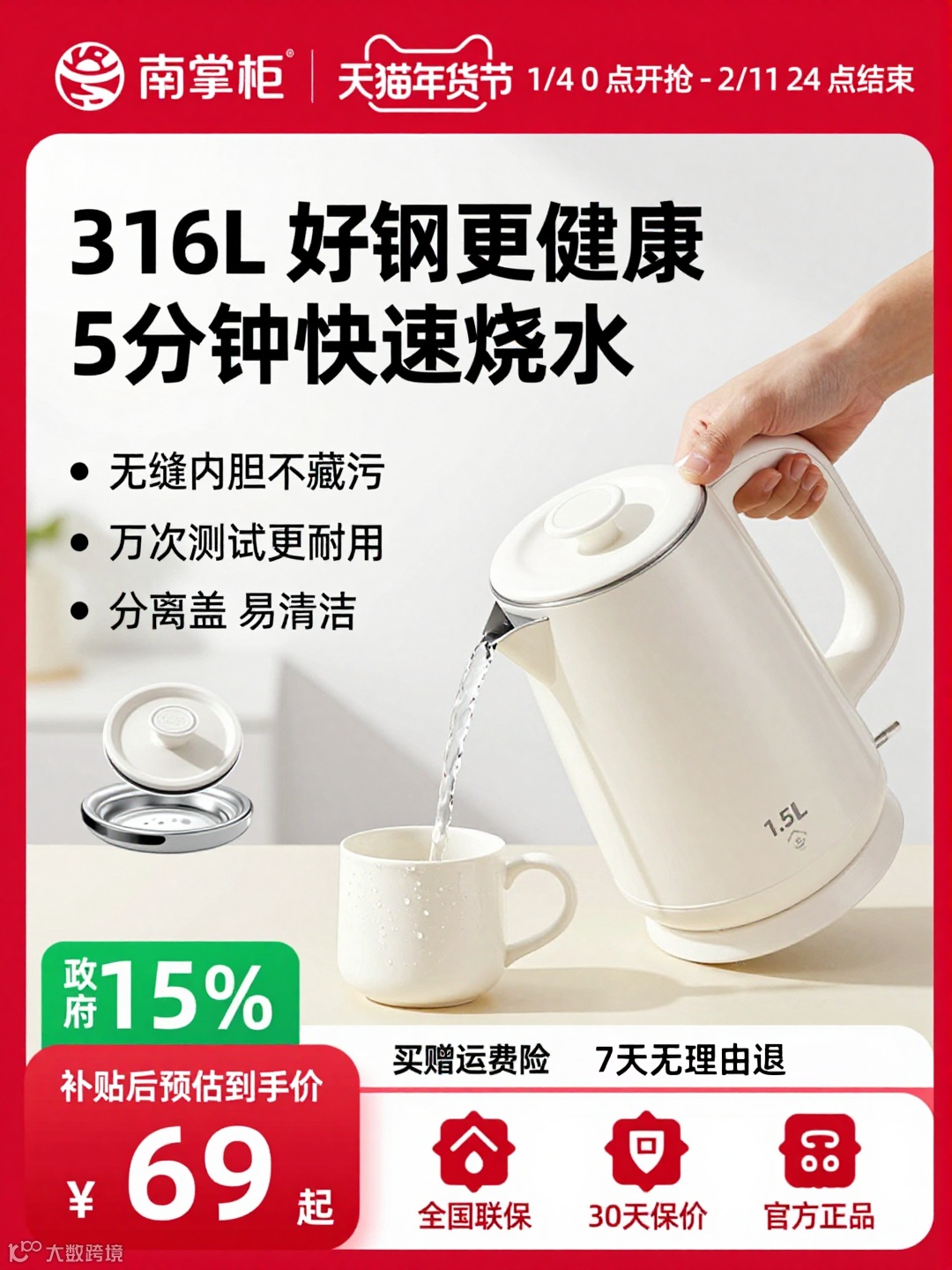 提示词:这张图是南掌柜品牌的电水壶促销广告,整体风格清晰明快: