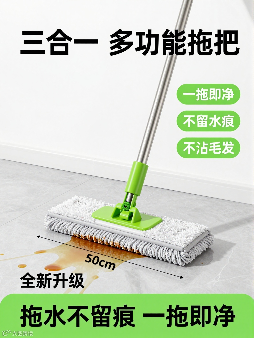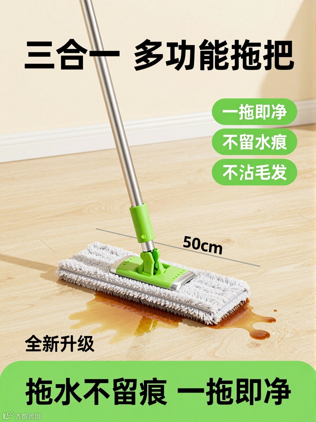 画面下方的文案强化卖点:左侧 “全新升级” 突出产品迭代,底部绿色区域再次强调 “拖水不留痕 一拖即净”