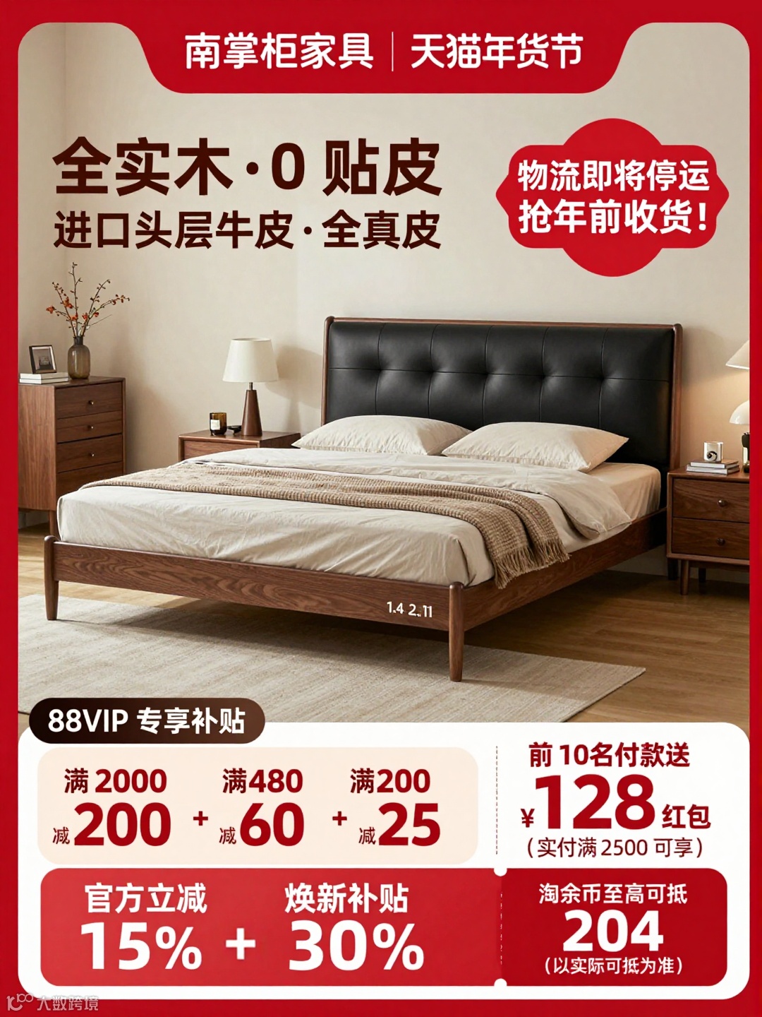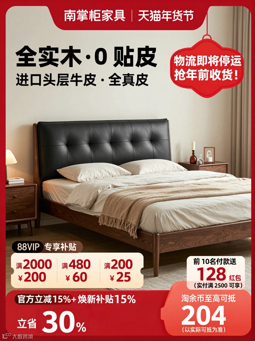 画面顶部红色横幅显示 “南掌柜家具 | 天猫年货节”;左上角用醒目文字突出产品材质:“全实木・0 贴皮”“进口头层牛皮・全真皮”;右上角红色装饰框提示 “物流即将停运 抢年前收货!”。