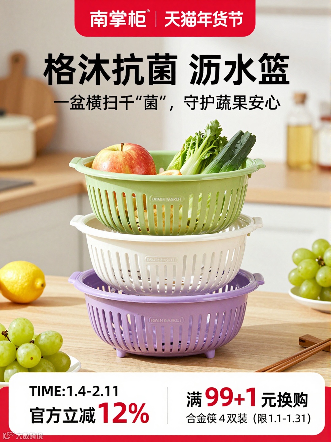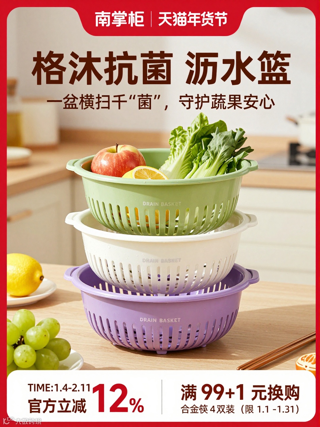 提示词:这是 “南掌柜” 品牌的年货节促销图,展示的是格沐抗菌沥水篮:
