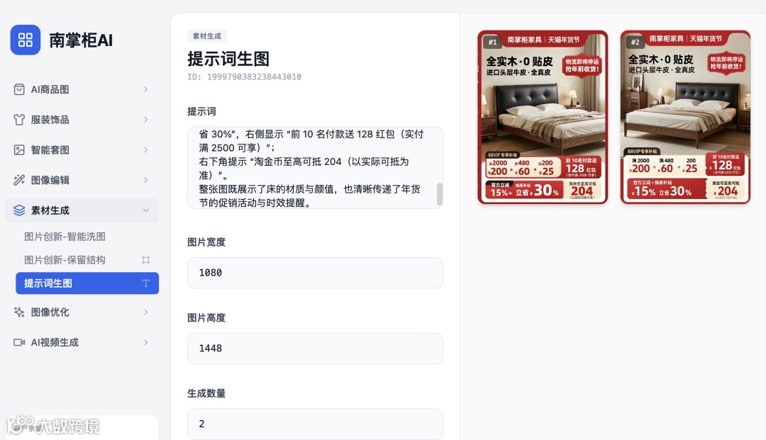 电商商家必备!南掌柜 AI「提示词生图」,输入提示词 10 秒出商品主图,无需 PS。应急作图、多风格找灵感、多平台铺货一键搞定,效率拉满,是你运营的高效辅助利器!
