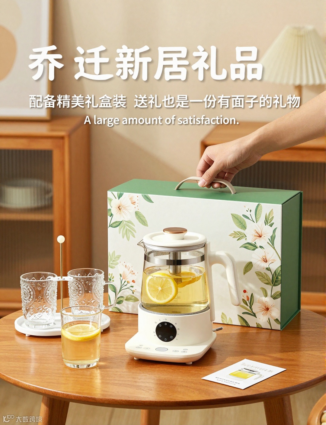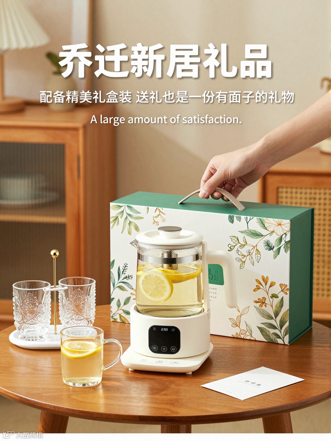 煮茶器后方是它的礼盒 —— 绿白配色的盒身印着清新的花卉图案,一只手正轻轻掀起礼盒的盖子。桌面右下角还放着一张小巧的卡片,背景里的木质家具与暖光,让整套礼品既显精致实用,又契合乔迁新居的温馨氛围。