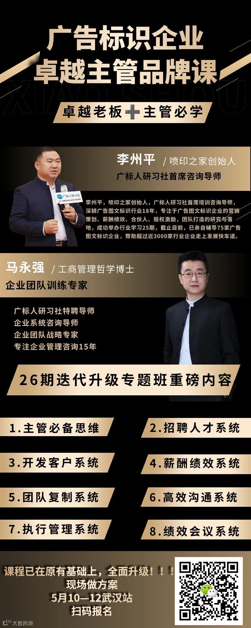 广标人研习社经过精心打磨,针对广告标识企业管理层能力提升再次更新升级,重磅推出第26期广标企业《卓越主管特训营》,快速帮你把复杂的事情简单化。