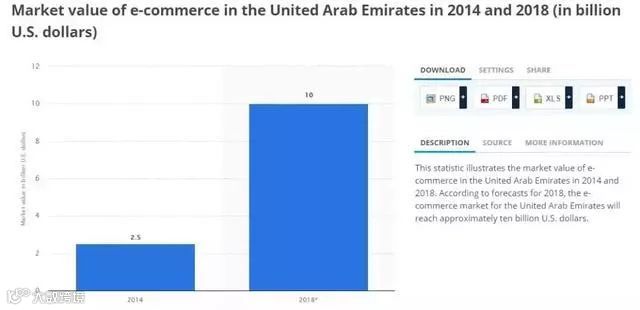 作为目前中东电商最大的市场,阿联酋B2C电商销售额从2015年到2017年间已经翻倍。根据Statista数据的预测,阿联酋的电子商务市场在2018年将达到约100亿美元,具有较大的市场发展空间。而其邻国、拥有三倍以上人口的沙特阿拉伯更是被认为未来几年电商销售额增速将超过阿联酋的增速,进而在2020年成为该区域电商最大市场。但是即使经历了多年的高速增长,中东电商销售额占社会零售总额也仅有2%左右。相比之下,中国电商占社会零售总额达到14%,中东电商增长空间之大可见一斑。