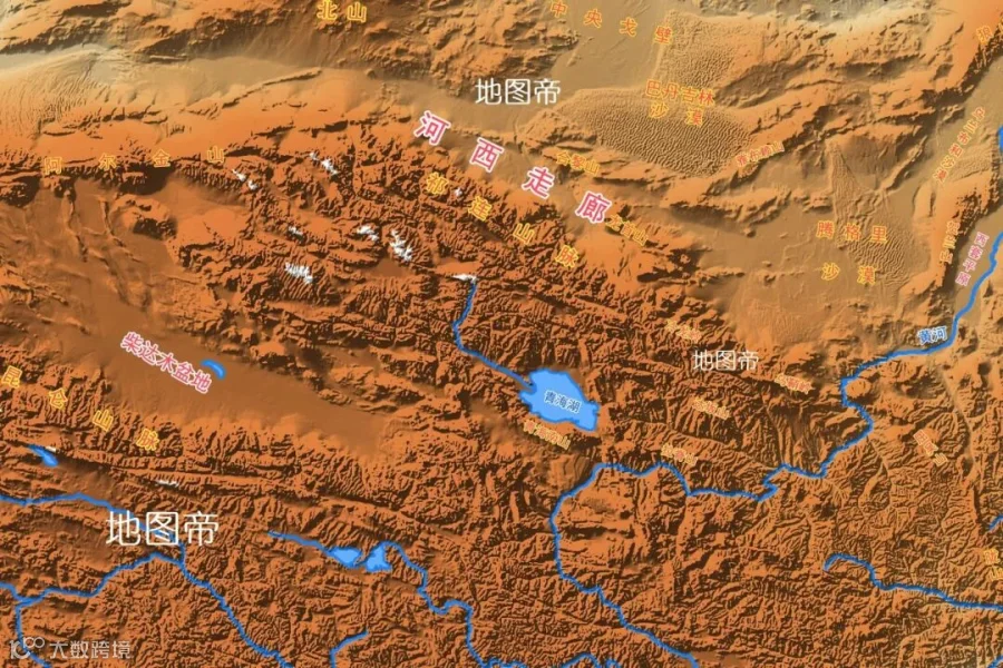 青藏高原北缘的祁连山脉,有雪水滋润,形成一道1000多千米、宽100-200千米的狭长绿色通道。由于地处黄河以西,是汉朝通往西域的必经之路,称为河西走廊。