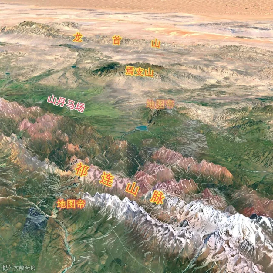 河西走廊南边是祁连山脉,面积约20.6万平方千米,山峰海拔多在4000米以上;北边是北山-合黎山-龙首山,绝大多数山峰海拔在2000-2500米之间。