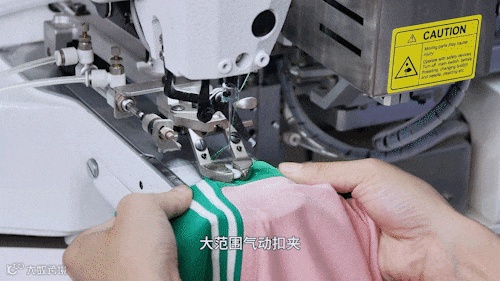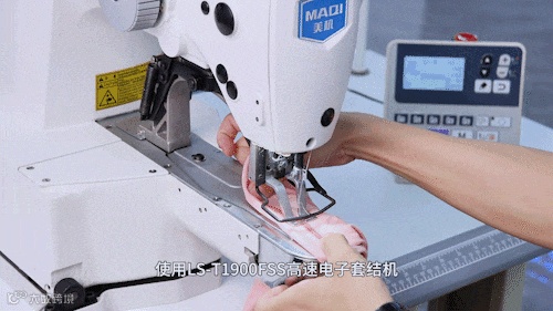 在卷边工序结束位置,采用LS-T1900FSS高速电子套结机进行套结封针,操作简便,环保高效。