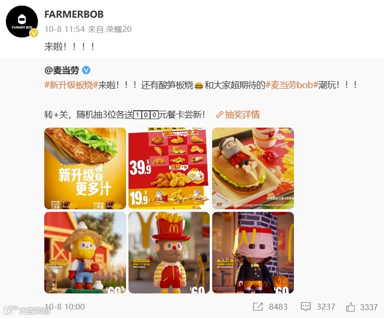 无论是FARMER BOB特色的设计元素融入麦当劳的产品包装,还是双方共同推出的限定款周边商品,都充分展现了这次合作的深度与广度,预示着潮流与快餐文化的碰撞将激发出更多新的火花。