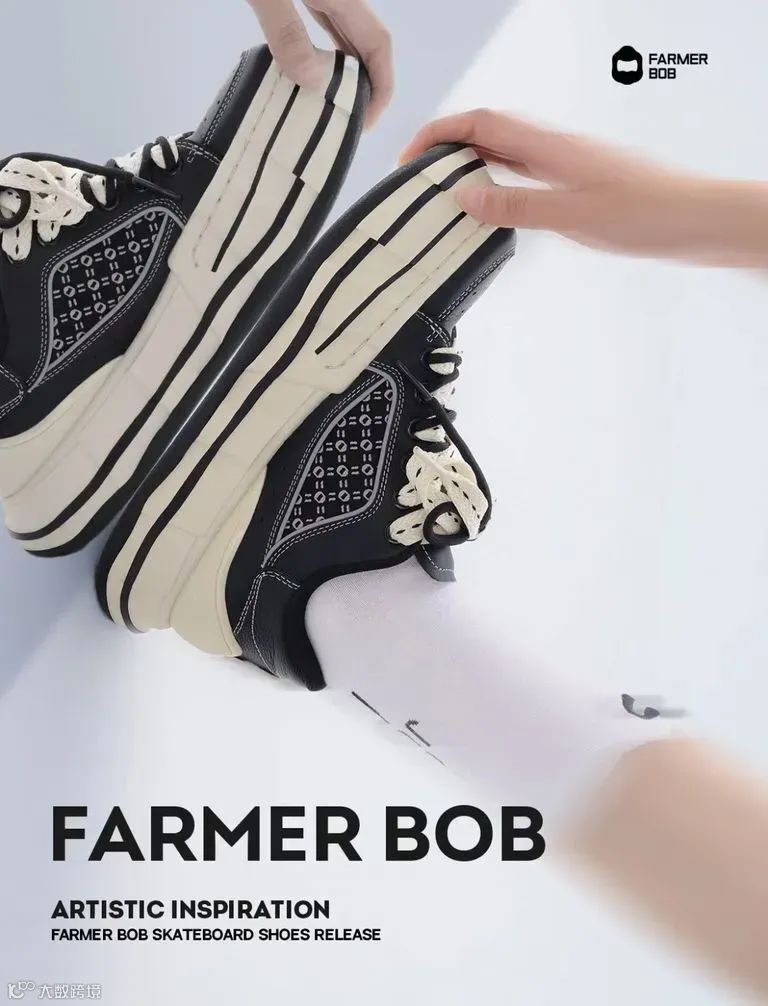 该鞋款以80年代的复古滑板鞋为设计蓝本,巧妙融合了FARMER BOB的经典LOGO电绣,营造出一种低调而内敛的时尚氛围。其先锋视觉的拼接廓形鞋底,更是传达出了潮流的新意。