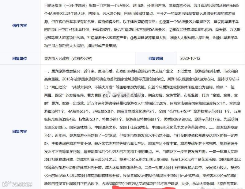 在去年,有网友咨询环巢湖的建设,巢湖市人民政府官方回复:占地3000亩的中庙万达文旅城项目即将落户建设。