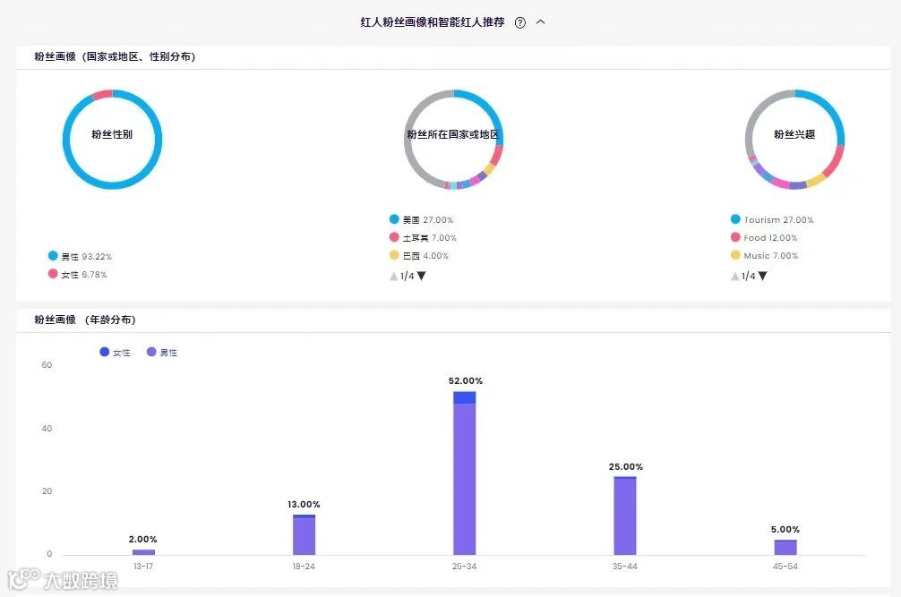 其中男粉丝比例达到93%,主要分布在美国、土耳其和巴西等国家,粉丝兴趣也聚集在家庭、旅行和摄影方面上。根据SocialBook的SaaS平台数据显示,Renan 平均每条推文的点赞达1.3万次,平均观看数达2.6万,数据相对比较稳定。