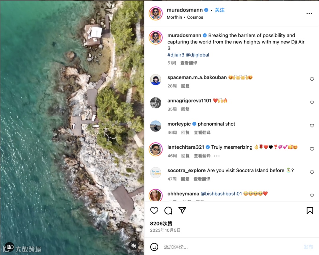 其中一个便是大疆创新科技有限公司,Murad 在社交媒体中发布的Dji无人机的拍摄视频,在社交媒体上获得了极高的观看量,帮助Dji拓宽了消费者群体。近期的一则无人机视频就收获了8206次点赞,以及31万次的视频播放量。