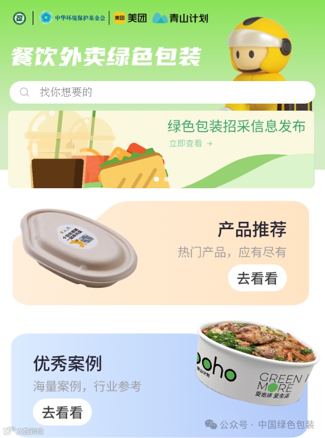 面向餐饮商家,平台量身打造绿色转型助推器,不仅构建一站式绿色包装方案库,汇聚经质量、安全、成本综合评估的优质环保包装供应商资源,有效降低商家的搜寻与试错成本,覆盖从餐具、餐盒到提袋的全品类包装需求,提供一体化解决方案;而且输出绿色包装消费偏好数据分析及趋势报告,助力商家优化产品组合,精准洞察市场先机。
