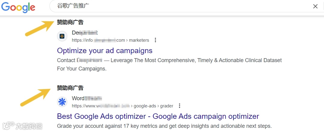 PPC是代表按点击付费的广告,它是一种搜索广告形式,营销人员付推广费以确保在搜索引擎结果页面顶部获得广告位,例如在搜索引擎搜索“谷歌广告推广”,这两个网站标记了“赞助商广告”。