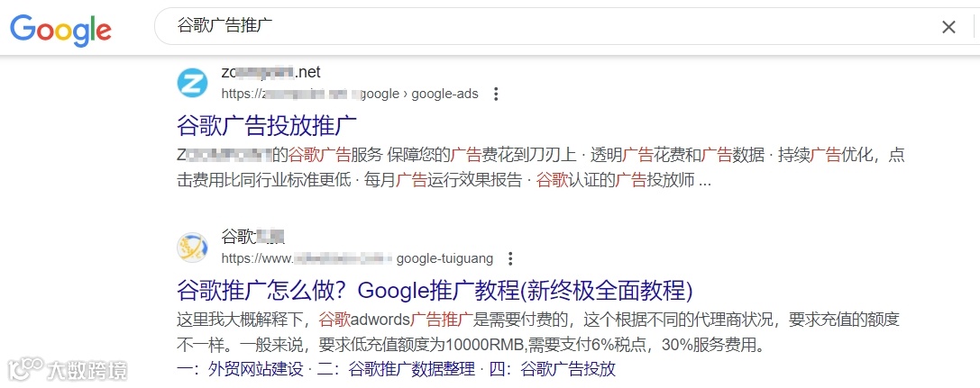 假设你在搜索引擎搜索“谷歌广告推广”,以下结果都是自然排名出现的(免费),没有标记“广告”“赞助”。