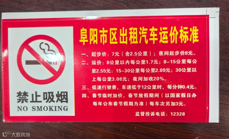 阜阳市区巡游出租汽车起步价7元(含2.5公里),夜间起步价8元;车公里运价,8公里以内每公里1.7元,8—15公里每公里2.55元,15—30公里每公里2.89元,30公里以上每公里3.06元,夜间加收20%。同时,低速行驶费,车速低于12公里时,每分钟0.4元。