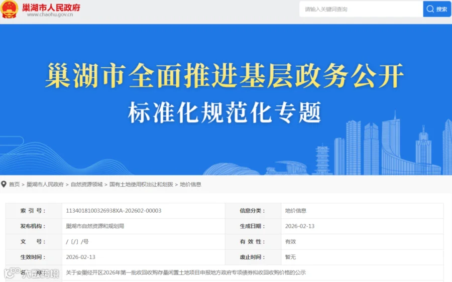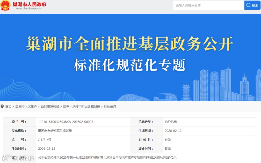 关于安巢经开区2026年第一批收回收购存量闲置土地项目申报地方政府专项债券拟收回收购价格的公示