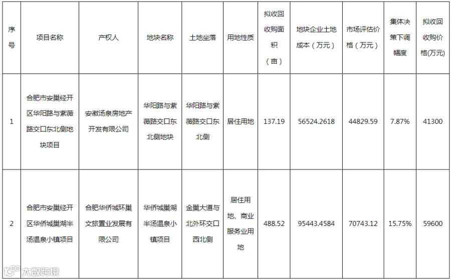 根据《自然资源部关于运用地方政府专项债券资金收回收购存量闲置土地的通知》(自然资发〔2024〕242号)、《自然资源部财政部关于做好运用地方政府专项债券支持土地储备有关工作的通知》(自然资发〔2025〕45号)、《安徽省自然资源厅安徽省财政厅关于做好2026年运用地方政府专项债券支持土地储备相关工作的通知》(皖自然资权函〔2026〕2号)等文件精神, 经安巢经开区2026年第2次主任办公会议、巢湖市土地管理委员会2026年第2次主任(扩大)会议集体决策,拟收回收购以下2宗国有建设用地,现就拟收回收购价格公示如下:
